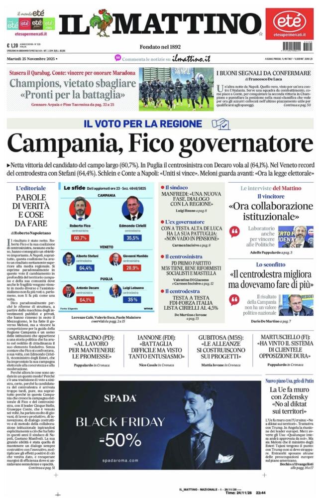 "Champions vietato sbagliare: pronti per la battaglia", scrive così in prima pagina Il Mattino nell'edizione odierna, presentando il match di stasera cruciale in ottica qualificazione per gli azzurri. Il sommario: "Stasera il Qarabag, Conte: «Vincere per onorare Maradona»". Di seguito la prima pagina integrale.
