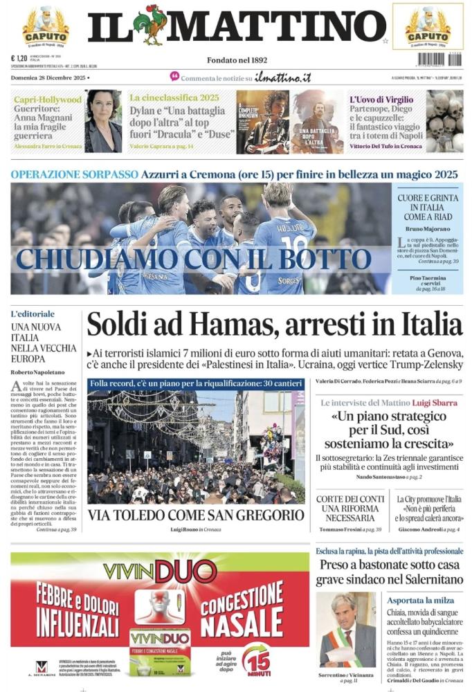 "Chiudiamo con il botto", scrive così in prima pagina Il Mattino nell'edizione odierna, parlando del Napoli che con una vittoria oggi terminerebbe nel migliore dei modi l'anno solare in cui sono arrivati ben due trofei, Scudetto e Supercoppa Italia. Il sommario: "Operazione sorpasso. Azzurri a Cremona (ore 15) per finire in bellezza un magico 2025". Di seguito la prima pagina integrale.
