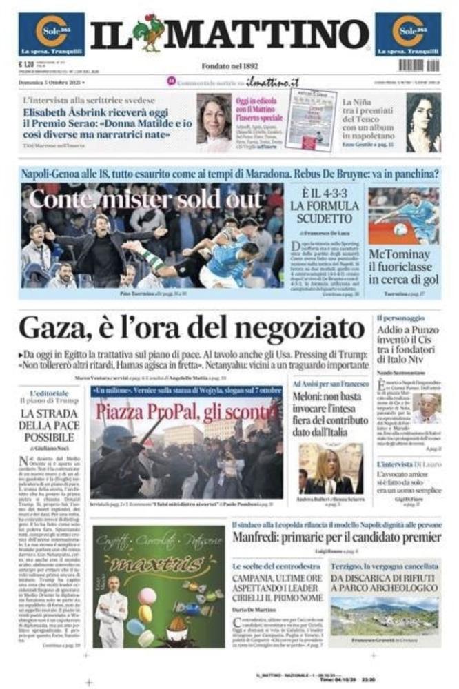 "Conte, mister sold out", scrive così in prima pagina Il Mattino nell'edizione odierna, parlando del pienone di tifosi previsto questa sera allo Stadio di Fuorigrotta. Il sommario: "Napoli-Genoa alle 18, tutto esaurito come ai tempi di Maradona. Rebus De Bruyne: va in panchina?". In spalla, un box è dedicato al centrocampista scozzese ed MVP della scorsa Serie A: "McTominay, il fuoriclasse in cerca del gol". Di seguito la prima pagina integrale.