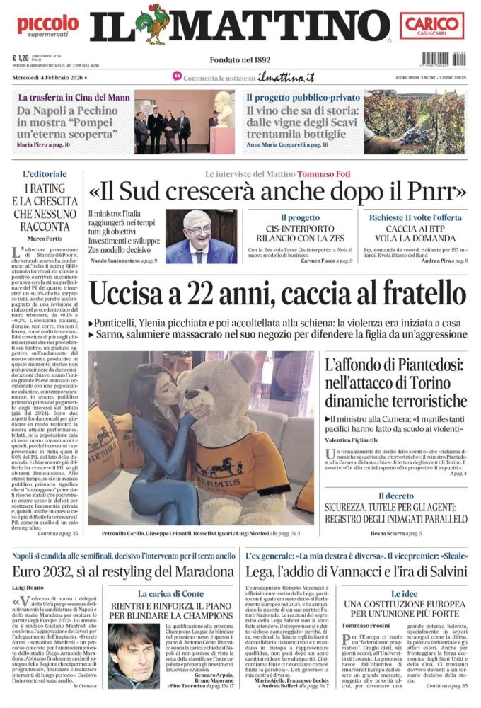 Il tema trova ampio spazio anche sulla prima pagina de Il Mattino, che titola: “Euro 2032, sì al restyling del Maradona”. Napoli punta a ospitare le semifinali, con un ruolo decisivo affidato agli interventi di riqualificazione previsti per il terzo anello dello Stadio Diego Armando Maradona.