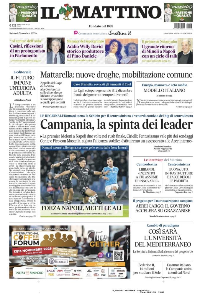 "Forza Napoli, metti le ali", scrive così in prima pagina Il Mattino nell'edizione odierna, in vista della partita di Serie A che attende la squadra di Antonio Conte. Il sommario: "Domani azzurri a Bologna, servono gol e assist dalle fasce laterali". Di seguito la prima pagina integrale.