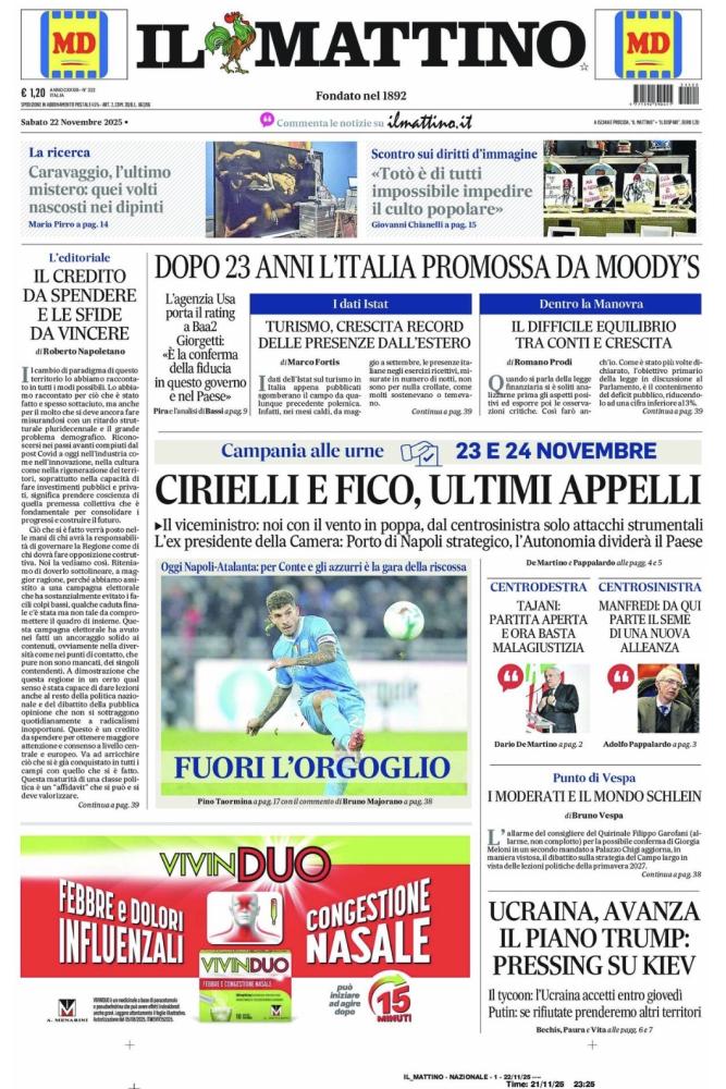 "Fuori l'orgoglio", scrive così in prima pagina Il Mattino nell'edizione odierna, presentando il match di stasera in cui gli azzurri devono cercare la vittoria dopo l'ultimo periodo difficile. Il sommario: "Oggi Napoli-Atalanta: per Conte e gli azzurri è la gara della riscossa". Di seguito la prima pagina integrale.