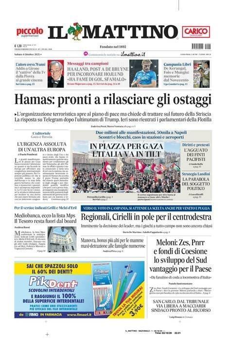Nell'edizione di oggi, Il Mattino dà spazio in prima pagina al messaggio social inviato dal bomber del Manchester City al centrocampista del Napoli e suo ex compagno di squadra Kevin De Bruyne: "Haaland, post a De Bruyne per incoronare Hojlund: 'Ha fame di gol, sfamalo'". In apertura la svolta in Medio Oriente: "Hamas: pronti a rilasciare gli ostaggi". Di seguito la prima pagina integrale.