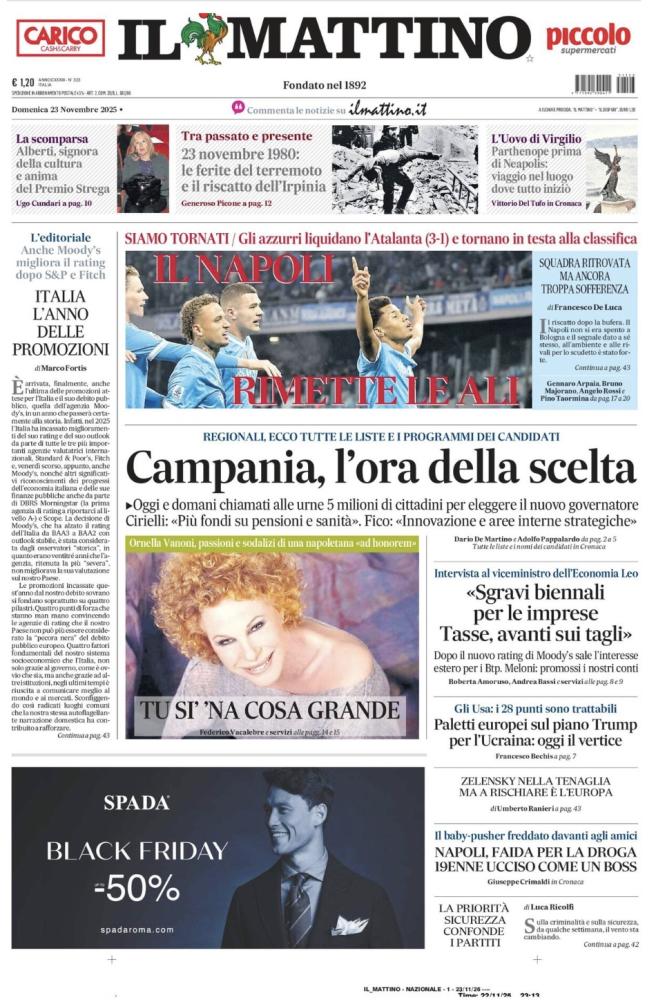 "Il Napoli rimette le ali", scrive così in prima pagina Il Mattino nell'edizione odierna, commentando la vittoria della squadra di Antonio Conte contro la Dea nel segno di David Neres e Noa Lang. Il sommario:"Siamo tornati! Gli azzurri liquidano l'Atalanta (3-1) e tornano in testa alla classifica". Di seguito la prima pagina integrale.