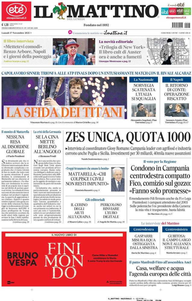 C'è spazio anche per la Nazionale italiana, che crolla in casa contro la Norvegia nella ripresa e che ora dovrà guadagnarsi la qualificazione ai Mondiali attraverso i play-off: "Norvegia scatenata, l'Italia si squaglia". In primo piano alto Sinner che trionfa alle ATP Finals di Torino battendo in finale Alcaraz: "La sfida dei Titani". Di seguito la prima pagina integrale.