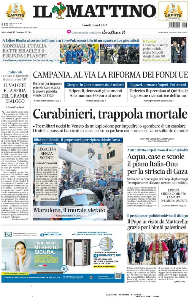 Nell'edizione di oggi, Il Mattino dedica spazio alla Nazionale italiana che ottiene la qualificazione aritmetica ai play-off delle qualificazioni ai Mondiali 2026: "L'Italia batte Israele 3-0 e blinda i playoff. A Udine 10mila al corteo, infiltrati tra i pro-Pal: scontri, feriti un agente e due giornalisti". A centro pagina il blitz anti-abusivi al Largo Maradona: "Maradona, il murale vietato. Il proprietario per ripicca chiude l'area". Di seguito la prima pagina integrale.