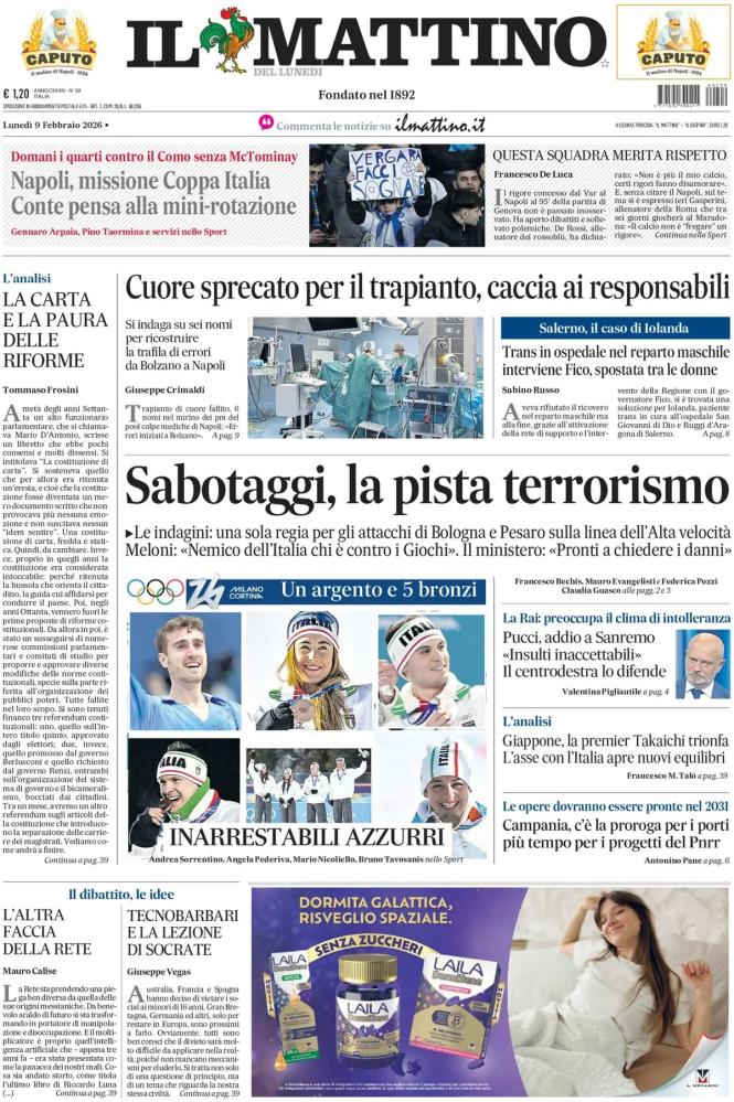 Nell'edizione di oggi, Il Mattino dedica spazio in prima pagina al Napoli che si appresta ad affrontare il Como per i quarti di finale di Coppa Italia: "Napoli, missione Coppa Italia. Conte pensa alla mini-rotazione. Domani i quarti contro il Como senza McTominay". Di seguito la prima pagina integrale.