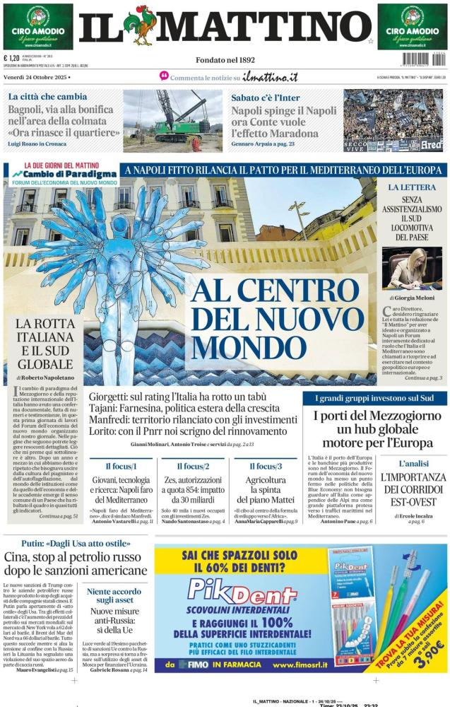 Meno uno a Napoli-Inter, match valido per l’ottava giornata del campionato di Serie A in programma domani alle ore 18:00 allo stadio Diego Armando Maradona. Nell'edizione di oggi, Il Mattino dedica l'apertura in prima pagina alla sfida tra gli azzurri e i nerazzurri: “Napoli spinge il Napoli: ora Conte vuole l’effetto Maradona”. Di seguito la prima pagina integrale.