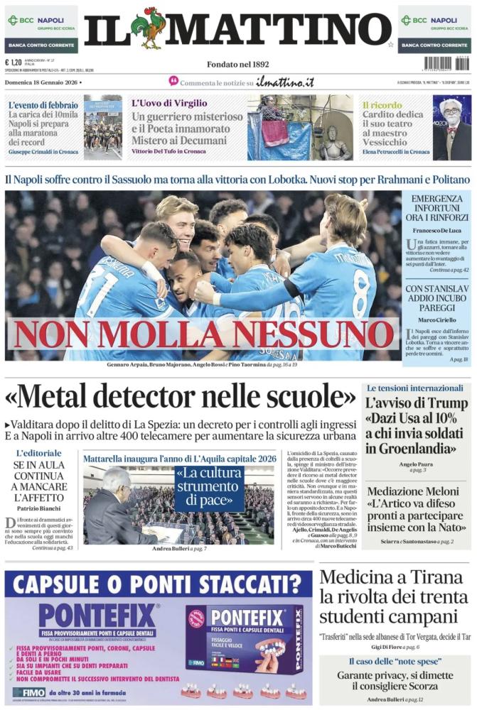 "Non molla nessuno", scrive così in prima pagina Il Mattino nell'edizione odierna, parlando della gara di ieri degli azzurri che hanno ritrovato i tre punti dopo tre pareggi di fila. Il sommario: "Il Napoli soffre contro il Sassuolo ma torna alla vittoria con Lobotka. Nuovi stop per Rrahmani e Politano". Di seguito la prima pagina integrale.