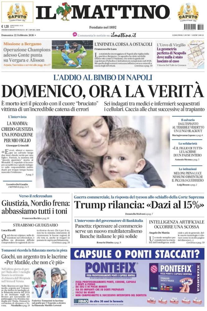 "Missione a Bergamo. Operazione Champions: adesso Conte punta su Vergara e Alisson", scrive così in prima pagina Il Mattino nell'edizione odierna, presentando il big match Atalanta-Napoli, in programma oggi alle 15:00. Al centro, spazio alla tragedia che ha scosso l'Italia: "Domenico, ora la verità. L'addio al bimbo di Napoli". Di seguito la prima pagina integrale.