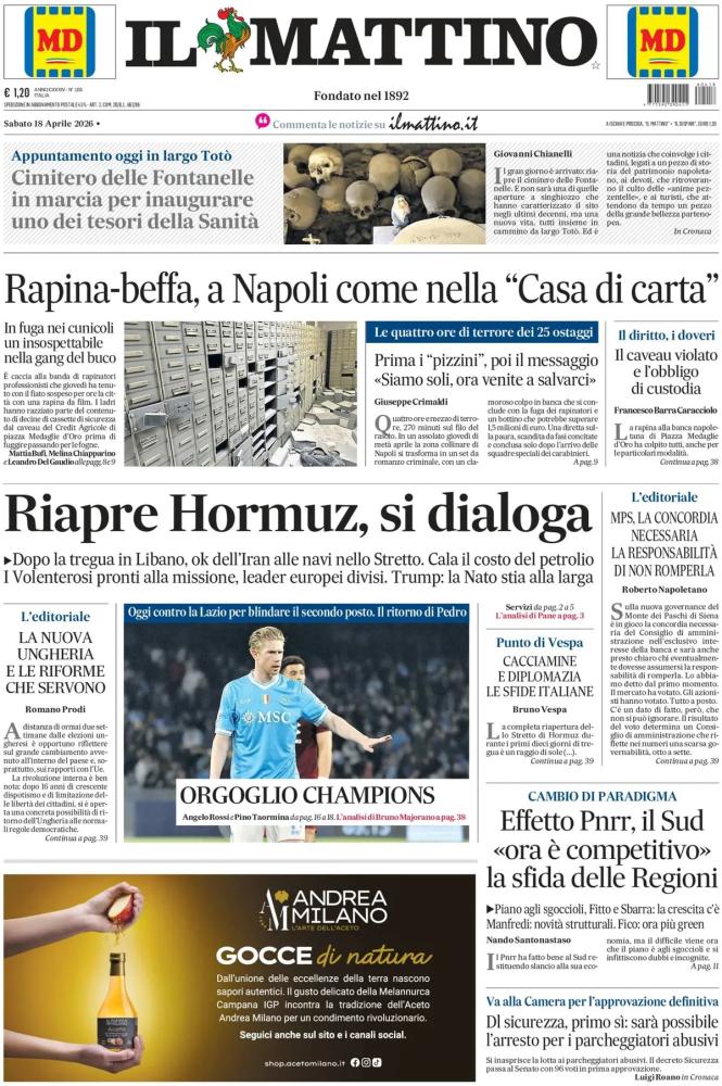 Nell'edizione di oggi, Il Mattino dedica ampio spazio in prima pagina al Napoli che affronta alle 18 la Lazio per ipotecare la qualificazione alla prossima Champions League: "Orgoglio Champions. Oggi contro la Lazio per blindare il secondo posto. Il ritorno di Pedro".