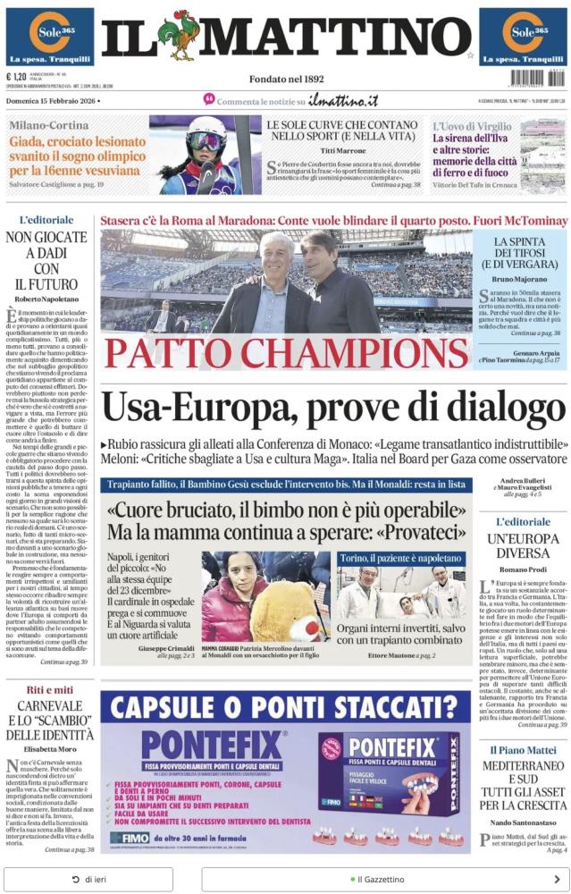 "Patto Champions", scrive così in prima pagina Il Mattino nell'edizione odierna, presentando lo scontro diretto che attende il Napoli in casa alle 20:45. Il sommario: "Stasera c'è la Roma al Maradona: Conte vuole blindare il quarto posto. Fuori McTominay". Di seguito la prima pagina integrale.