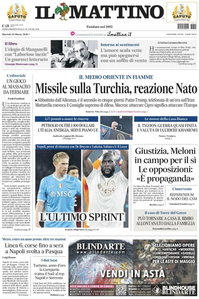 "L'ultimo sprint", scrive così in prima pagina Il Mattino nell'edizione odierna, presentando la fase finale della stagione degli azzurri di Antonio Conte. Il sommario: "Napoli, prove di rimonta con De Bruyne e Lukaku. Sabato c'è il Lecce". Di seguito la prima pagina integrale.