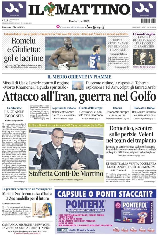 "Romelu e Giulietta: gol e lacrime", il gioco di parole con cui nella prima pagina odierna Il Mattino commenta la rete di Big Rom, che in extremis ha regalato i tre punti al Napoli. Il sommario: "Lukaku dedica il gol al padre scomparso: Verona ko al 96'. Conte: 'Il futuro? Ancora un anno di contratto'". Di seguito la prima pagina integrale.