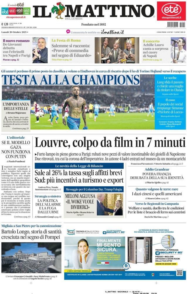 Nell'edizione di oggi, Il Mattino apre in prima pagina con il Napoli che si appresta ad affrontare la sfida di Champions League in Olanda contro il Psv Eindhoven: "Testa alla Champions. Gli azzurri perdono il primo posto in classifica e volano a Eindhoven in cerca di riscatto dopo il ko di Torino: Hojlund verso il recupero". Di seguito la prima pagina integrale.