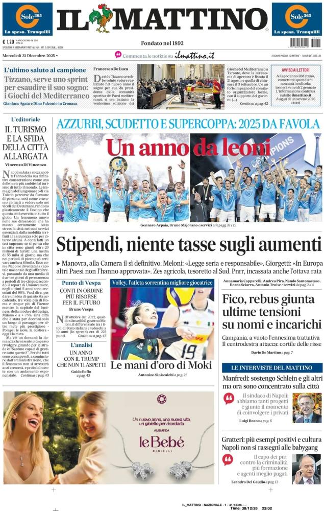 Nell'edizione di oggi, Il Mattino dedica l'apertura in prima pagina al 2025 straordinario del Napoli: "Un anno da leoni. Azzurri, Scudetto e Supercoppa: 2025 da favola". A centro pagina spazio a Monica De Gennaro, la pallavolista di origine sorrentina conquista il pallone d'oro del volley: "Le mani d'oro di Moki". Di seguito la prima pagina integrale.