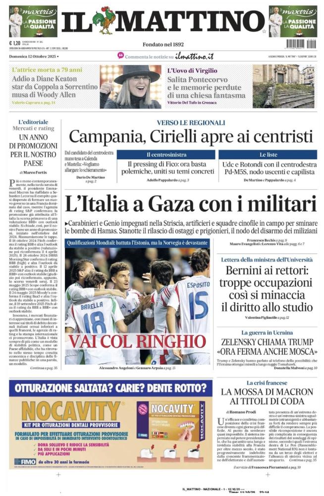 "Vai col Ringhio", apre così in prima pagina Il Mattino nell'edizione odierna, in riferimento alla terza vittoria di Gennaro Gattuso da commissario tecnico dell'Italia. Il sommario: "Qualificazioni Mondiali: battuta l'Estonia, ma la Norvegia è devastante". Di seguito la prima pagina integrale.