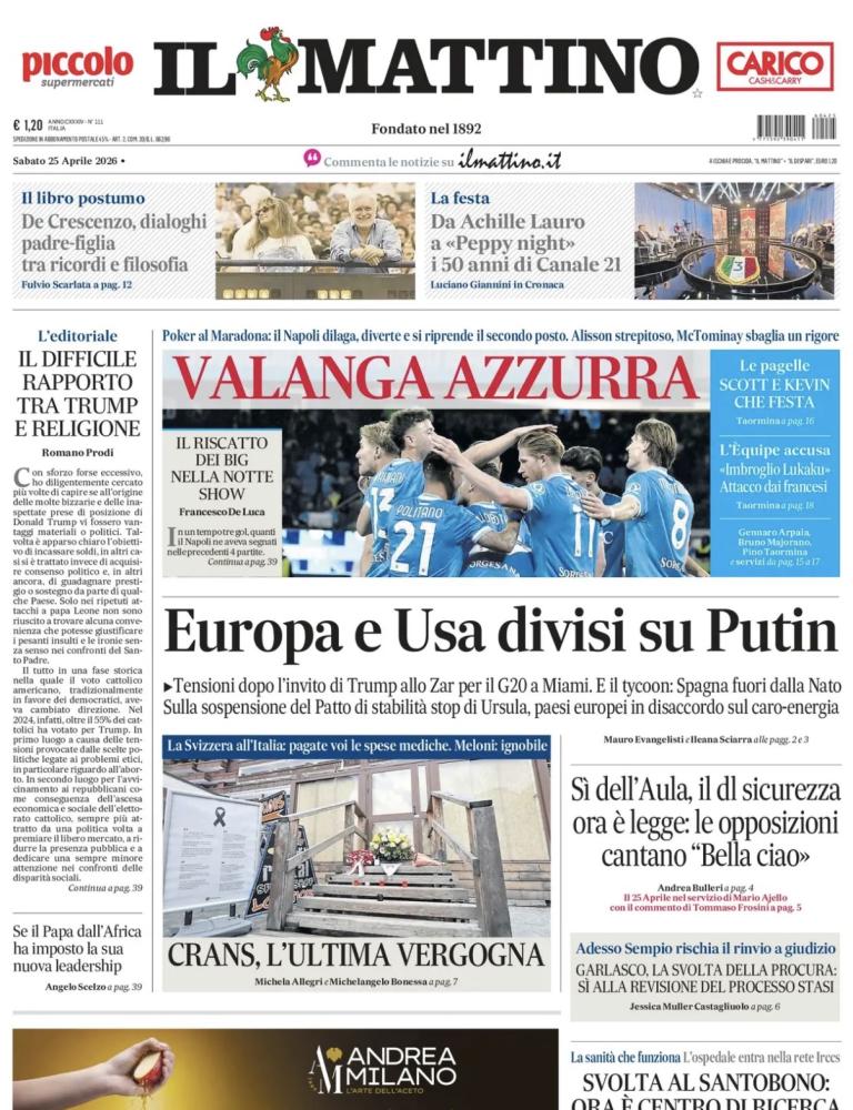 Valanga azzurra, titola in prima pagina il quotidiano napoletano Il Mattino raccontando della vittoria del Napoli contro la Cremonese per 4-0. Il Napoli dilaga e si diverte - scrive il quotidiano - e si riprende il secondo posto con un Alisson strepitoso. Il riscatto dei big nella notte show il fondo di Francesco De Luca. Di seguito la prima pagina integrale