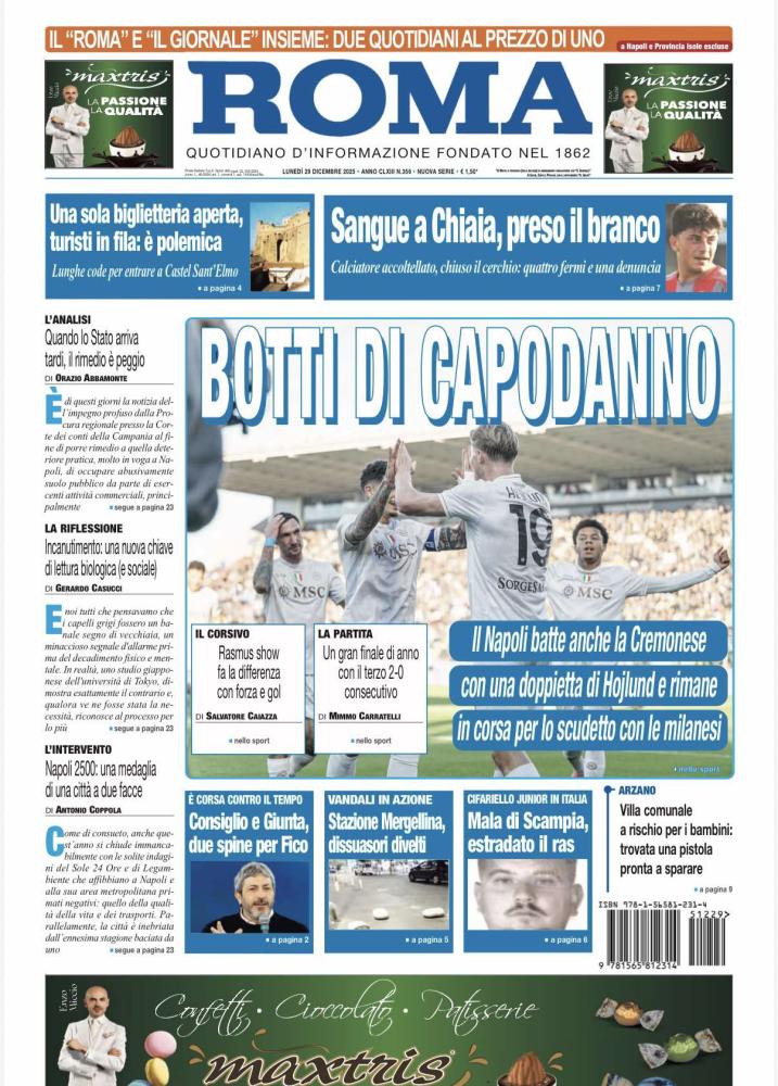 Nell'edizione di oggi, Il Roma dedica l'apertura in prima pagina al Napoli, che torna alla vittoria in trasferta battendo 2-0 la Cremonese: "Botti di Capodanno. Il Napoli batte anche la Cremonese con una doppietta di Hojlund e rimane in corsa per lo scudetto con le milanesi". Di seguito la prima pagina integrale.