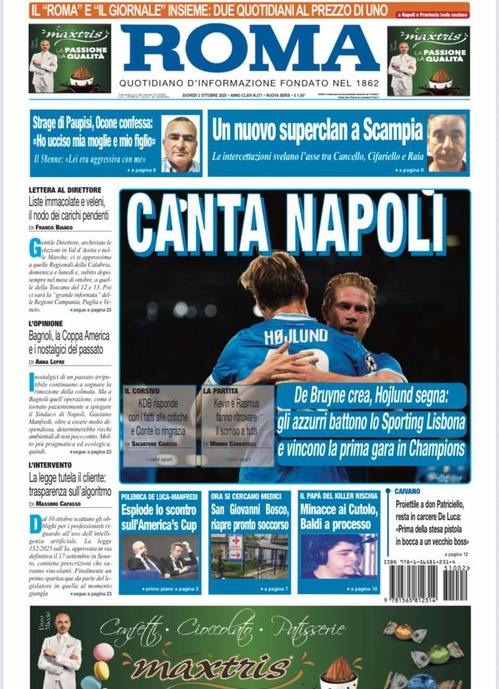 "Canta Napoli", apre così in prima pagina il quotidiano Il Roma nell'edizione odierna, parlando del successo europeo della squadra di Antonio Conte. Il sommario: "De Bruyne crea, Hojlund segna: gli azzurri battono lo Sporting Lisbona e vincono la prima gara in Champions". Di seguito la prima pagina integrale.