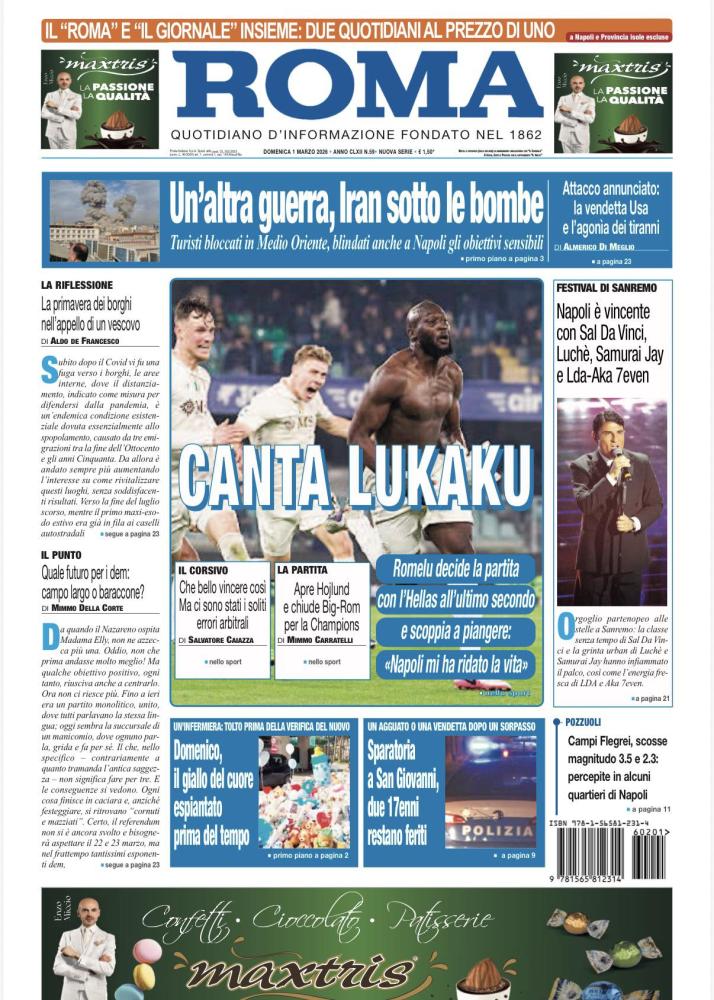 "Canta Lukaku", scrive così in apertura Il Roma nella prima pagina odierna, dedicata a Big Rom che ha regalato tre punti al Napoli in extremis. Il sommario: "Romelu decide la partita con l'Hellas all'ultimo secondo e scoppia a piangere: 'Napoli mi ha ridato la vita'". Di seguito la prima pagina integrale.