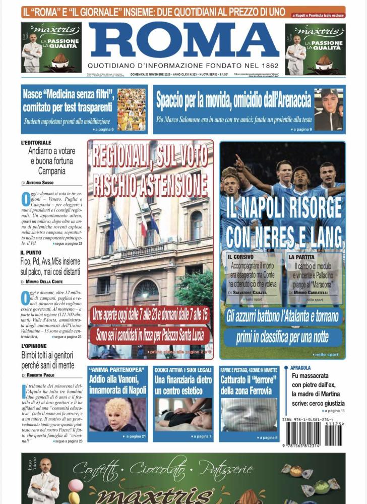 "Il Napoli risorge con Neres e Lang", scrive così in prima pagina il quotidiano Il Roma nell'edizione odierna, commentando la vittoria della squadra di Antonio Conte nel segno delle due ali d'attacco. Il sommario: "Gli azzurri battono l'Atalanta e tornano primi in classifica per una notte". Di seguito la prima pagina integrale.