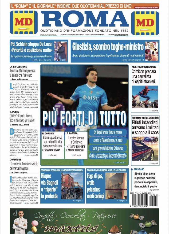 "Più forti di tutto", apre così in prima pagina il quotidiano Il Roma nell'edizione odierna, riferendosi all'ennesima defezione della stagione, stavolta occorsa al capitano azzurro. Il sommario: "Un Napoli eroico torna a vincere contro la Fiorentina, ma c'è ansia per il grave infortunio a Di Lorenzo. Conte: «Incazzato per il mercato bloccato»". Di seguito la prima pagina integrale.