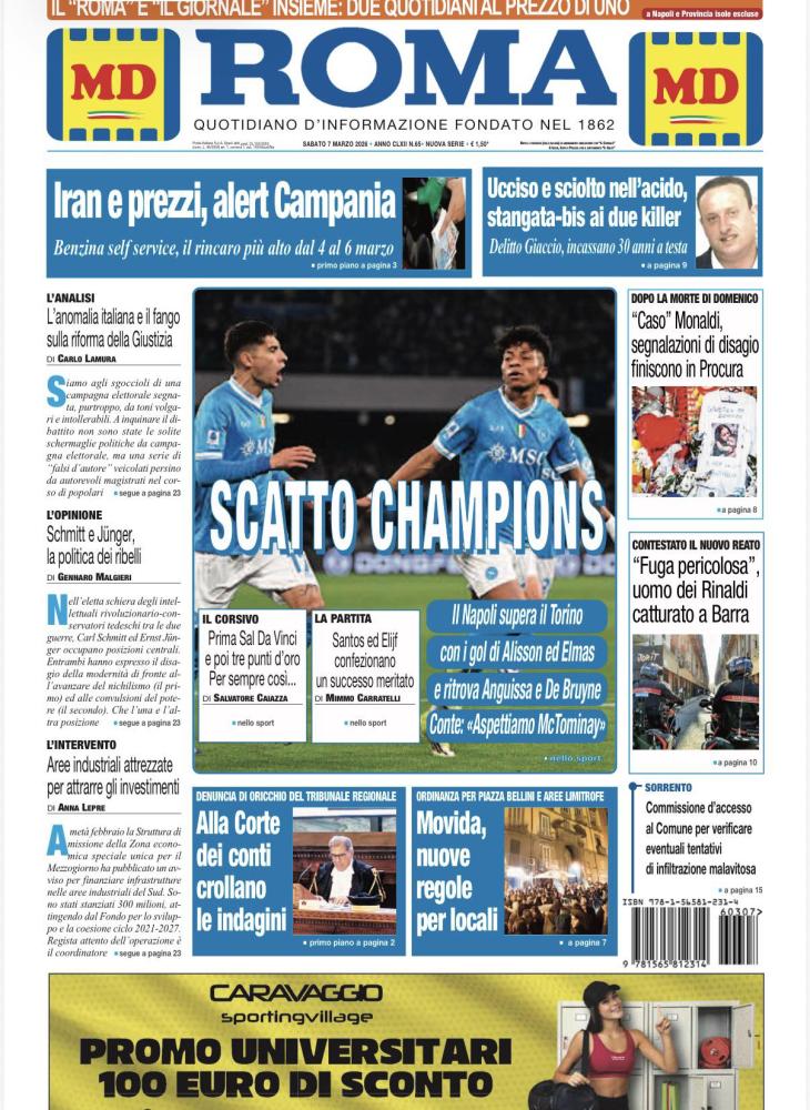 Nell'edizione di oggi, Il Roma apre in prima pagina con la vittoria del Napoli contro il Torino che permette agli azzurri di allungare momentaneamente a +8 sul quinto posto: "Scatto Champions. Il Napoli supera il Torino con i gol di Alisson ed Elmas e ritrova Anguissa e De Bruyne. Conte: 'Aspettiamo McTominay'". Di seguito la prima pagina integrale.