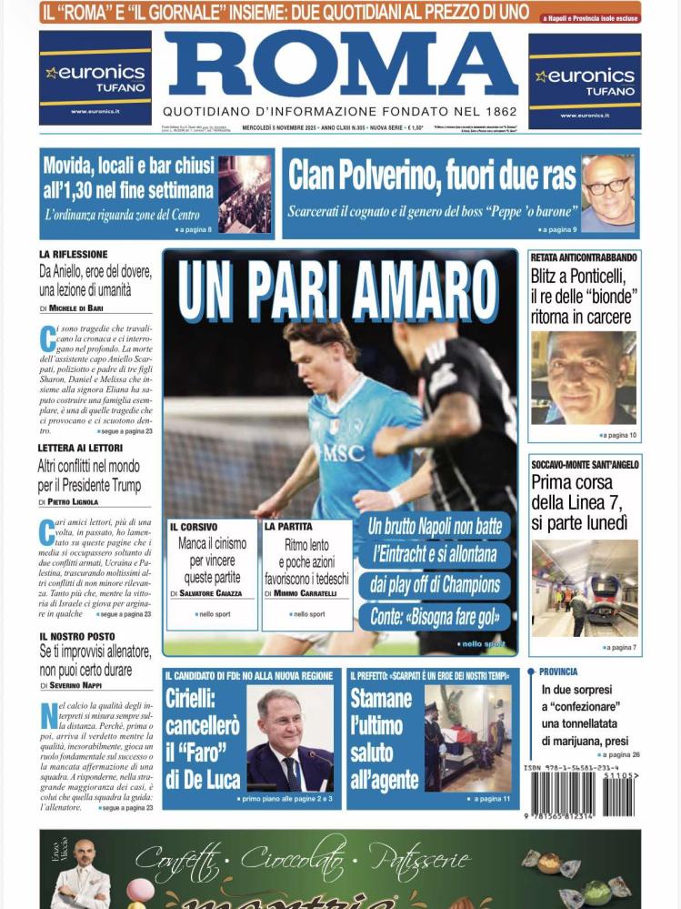"Un pari amaro" è il titolo del quotidiano Roma oggi in edicola. "Un brutto Napoli non batte l'Eintracht e si allontana dai playoff di Champions". Nelle pagine interne le analisi dei giornalisti e anche le voci dei protagonisti, partendo da Conte che in conferenza ha fatto riferimento anche al doppio impegno settimanale che, unito agli infortuni, sta pesando nella testa e nelle gambe dei giocatori.