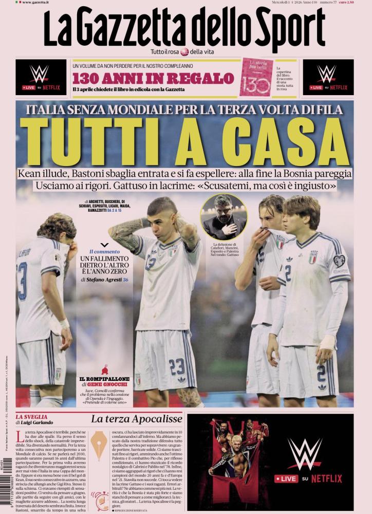 La prima pagina della Gazzetta dello Sport di mercoledì 1 aprile 2026 è uno schiaffo. Titolo a caratteri cubitali, giallo su blu: "TUTTI A CASA". Il sottotitolo che taglia come un coltello: "Italia senza Mondiale per la terza volta di fila". Non c'è bisogno di aggiungere altro. Il giornale rosa racconta, in poche parole, una notte che resterà nella memoria dolorosa del calcio italiano. Per la terza volta di fila gli azzurri restano fuori dai Mondiali, giustiziati dalla Bosnia dopo i disastri con Svezia nel 2018 e Macedonia del Nord nel 2022.