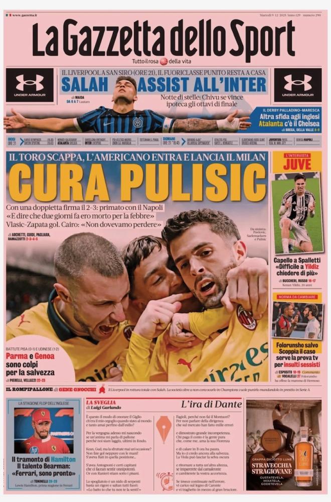 "Cura Pulisic" è il titolo con cui si apre l'edizione odierna de La Gazzetta dello Sport sulla vittoria del Milan contro il Torino nel posticipo di ieri sera. La doppietta dell'americano consente ai rossoneri di rimontare da 2-0 a 2-3 la squadra di Baroni e rilancia il Milan in vetta al campionato insieme al Napoli. L'operazione aggancio riesce, si legge sul quotidiano.