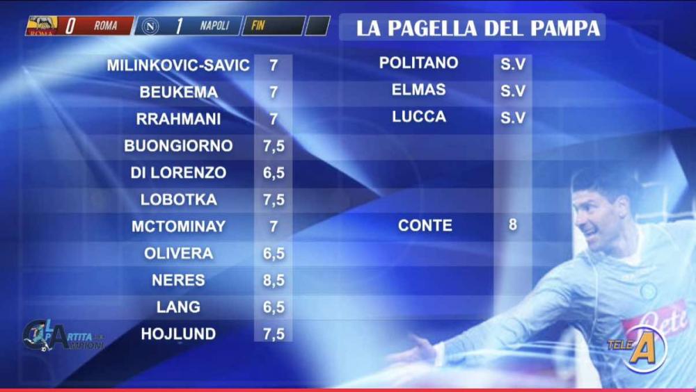Roberto 'El Pampa' Sosa, ex attaccante azzurro, ai microfoni di Tele A nel corso de 'La Partita dei Campioni' ha dato le sue pagelle per Roma-Napoli 0-1: Voti altissimi, fioccano i 7, 7,5 a Buongiorno, Lobotka e Hojlund. 8,5 al migliore in campo David Neres, che con un gol in ripartenza ha deciso il match. 8 per Antonio Conte, che stravince la sfida tattica con Gasperini. Di seguito le pagelle complete dell'argentino