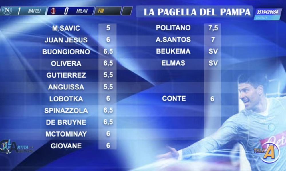 Roberto 'El Pampa' Sosa, ex calciatore azzurro, ai microfoni di Tele A nel corso de 'La Partita dei Campioni' ha dato le sue pagelle per Napoli-Milan 1-0. L'autore del gol vittoria Matteo Politano è il migliore con un 7,5 insieme ad Alisson Santos a cui va un 7; sufficienza per Giovane e per l'allenatore Conte. l'unico insufficiente è Milinkovic-Savic: 5 per il portiere.