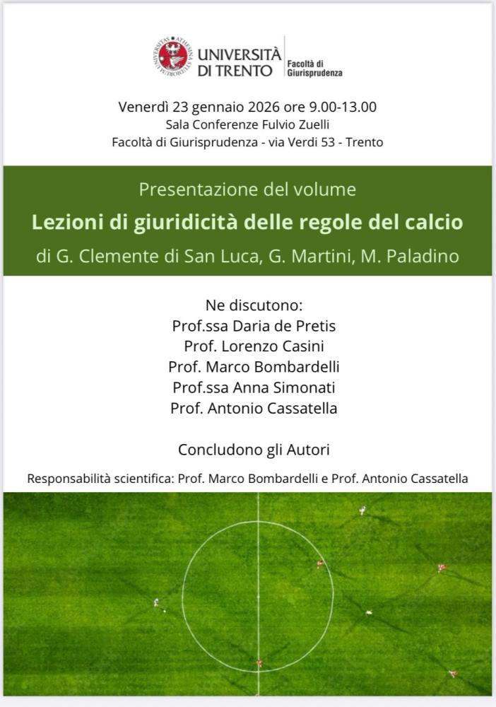 "Lezioni di giuridicità delle regole del calcio", il nuovo volume a firma del Professore Guido Clemente di San Luca, autore insieme a Giovanni Martini e Mario Paladino, sarà presentato domani, venerdì 23 gennaio dalle ore 09:00 alle 13:00, presso la Sala Conferenze Fulvio Zuelli della Facoltà di Giurisprudenza di Trento, in Via Verdi 53. Alla discussione parteciperanno: la Professoressa Daria De Pretis, il Professor Lorenzo Casini, il Professor Marco Bombardelli, la Professoressa Anna Simonati, il Professor Antonio Cassatella. Di seguito la locandina dell'evento.
