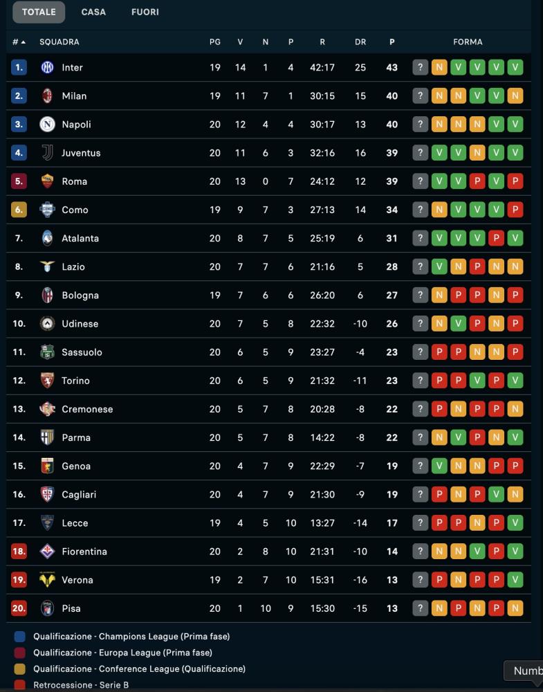 Serie A, classifica: che frenata! Il Napoli rischia di perdere contatto dalle prime