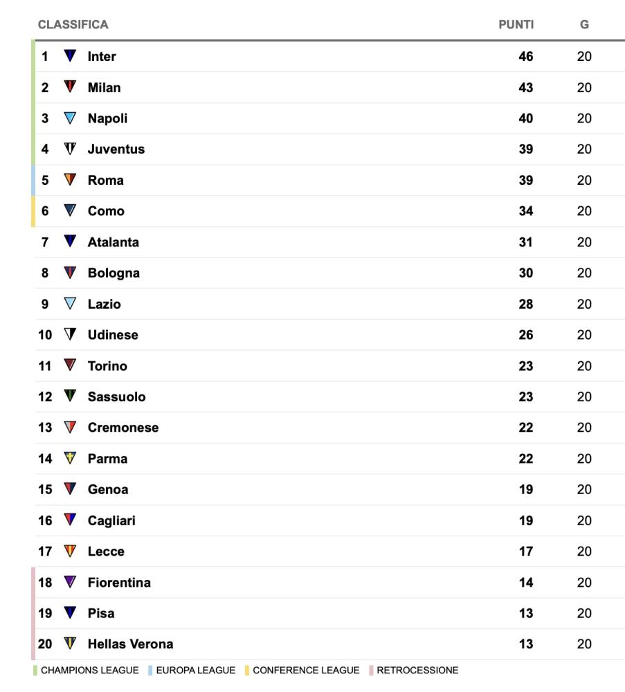 Serie A, la classifica: il Milan resta in scia all’Inter e allunga sul Napoli