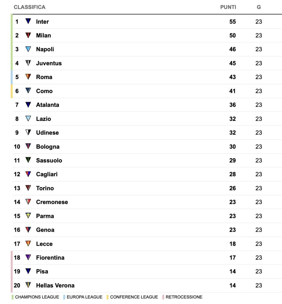 Il Milan risponde alle vittorie del week-end di Napoli e Juventus e allunga a +7 sul quinto posto, occupato ora dalla Roma. I rossoneri mantengono invariata la distanza dalla capolista Inter, sempre avanti di 5 lunghezze. Continua il momento di grande difficoltà del Bologna, ora addirittura precipitato al decimo posto e sempre più lontano dalla zona Europa. Di seguito la classifica aggiornata dopo la 23esima giornata: