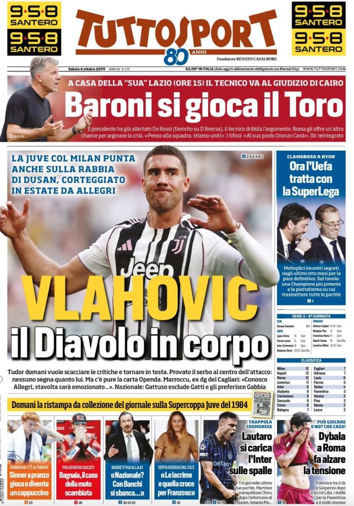 Domani sera all'Allianz Stadium, la squadra di Igor Tudor ospiterà quella di Allegri nel big match di giornata. Sarà la sfida di Dusan Vlahovic, corteggiato a lungo dal tecnico rossonero ma che alla fine è rimasto in bianconero. Questo il titolo in prima pagina dell'edizione odierna di Tuttosport: "Vlahovic, diavolo in corpo". In taglio alto invece il Torino: “Baroni si gioca il Toro”, sulla sfida sul campo della Lazio alle 15 che può valere la panchina. Cairo ha già allertato De Rossi, favorito su D’Aversa.