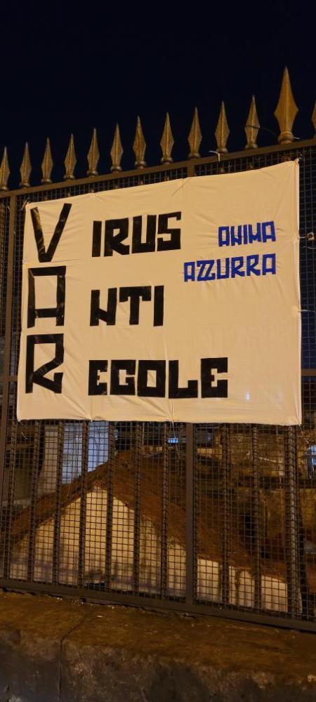 "VAR: virus anti regole", recita uno striscione spuntato al Rione Sanità a Napoli in protesta contro arbitri e VAR, a seguito degli episodi tanto discussi negli ultimi giorni: "Ci troviamo difronte all'ennesimo 'attacco totale' nei nostri confronti. Vogliono creare il caso tecnico-tattico, il caso allenatore, il caso del non reggere 3 competizioni. Assurdo! Stiamo facendo miracoli!