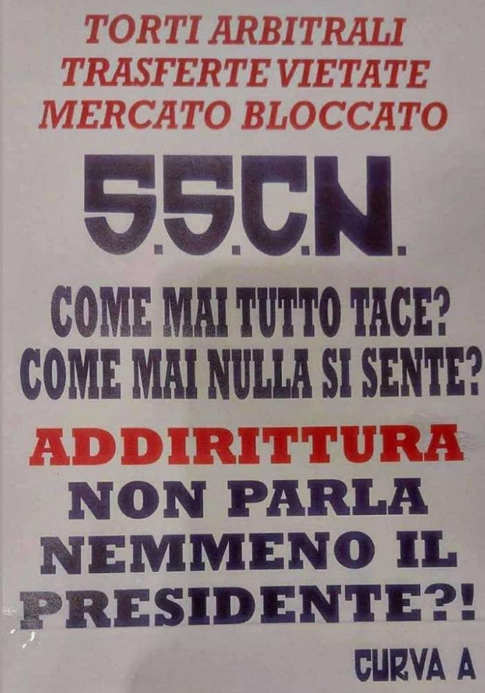 Di seguito il testo del volantino: "Torti arbitrali, trasferte vietate, mercato bloccato. SSCN come mai tutto tace? Come mai nulla si sente? Addirittura non parla nemmeno il presidente?!"