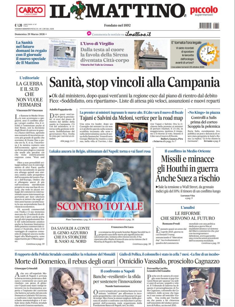 Come accade quasi sempre in prima pagina, anche oggi II Mattino dedica un titolo al Napoli ed è il seguente: "Scontro totale". II riferimento è al caso Lukaku, che è ancora in Belgio invece di essere a Castel Volturno agli ordini di Antonio Conte per preparare i primi impegni post sosta delle Nazionali.