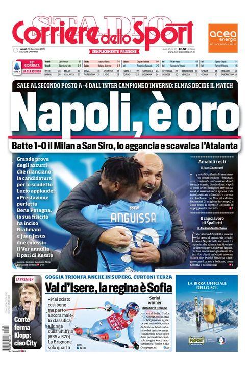 "Napoli, è oro!", titola il Corriere dello Sport edizione Campania, dedicando la prima pagina alla vittoria del Napoli contro il Milan nel big match dello Stadio San Siro: "Sale al secondo posto a -4 dall'Inter campione d'inverno: Elmas decide il match. Batte 1-0 il Milan a San Siro, lo aggancia e scavalca l'Atalanta".