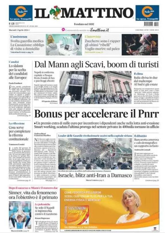 Nell'edizione odierna, Il Mattino apre in prima pagina parlando della questione razzismo che ha coinvolto Juan Jesus: "Se solo il Napoli si inginocchia contro il razzismo". Spazio anche al tennista Jannik Sinner dopo il successo a Miami: "Sinner, vita da fenomeno: ora l'obiettivo è il primato".