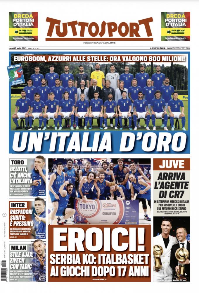 Nell'edizione di oggi, Tuttosport in prima pagina apre con le quotazioni degli Azzurri di Mancini salite alle stelle: "Un'Italia d'oro. Ora valgono 800 milioni!". Di spalla spazio al futuro di Ronaldo: "Juve, arriva l'agente di CR7". In basso spazio all'impresa della Nazionale italiana di basket: "Eroici! Serbia ko: Italbasket ai Giochi dopo 17 anni".