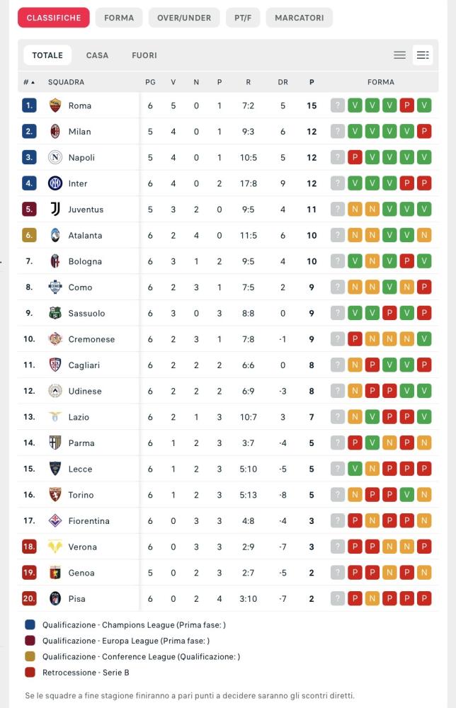Napoli chiamato a rispondere alla Roma di Gasperini, che si ritrova in vetta alla classifica grazie al 2-1 corsaro del Franchi: sconfitta, ancora una volta, la Fiorentina. Al Dall'Ara, invece, il Bologna ha travolto il Pisa raggiungendo quota 10 punti. Di seguito la graduatoria aggiornata: