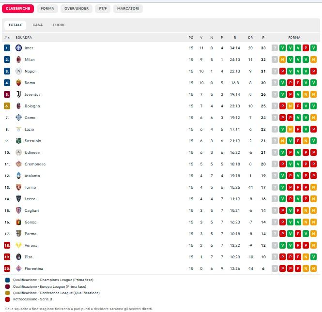 La Roma chiude con un successo la quindicesima giornata del campionato di Serie A, tenendo a distanza di sicurezza il Como di Cesc Fabregas. Con questo risultato, i giallorossi si portano infatti a -3 dall’Inter capolista, ristabilendo il vantaggio di quattro punti sulla Juventus quinta e portandosi a solo un punto dal Napoli. Considerati gli impegni di Inter, Milan e Napoli in Supercoppa, la squadra di Gian Piero Gasperini potrebbe virtualmente festeggiare il Natale da prima. Di seguito la classifica di Serie A dopo la 15ª giornata di campionato.