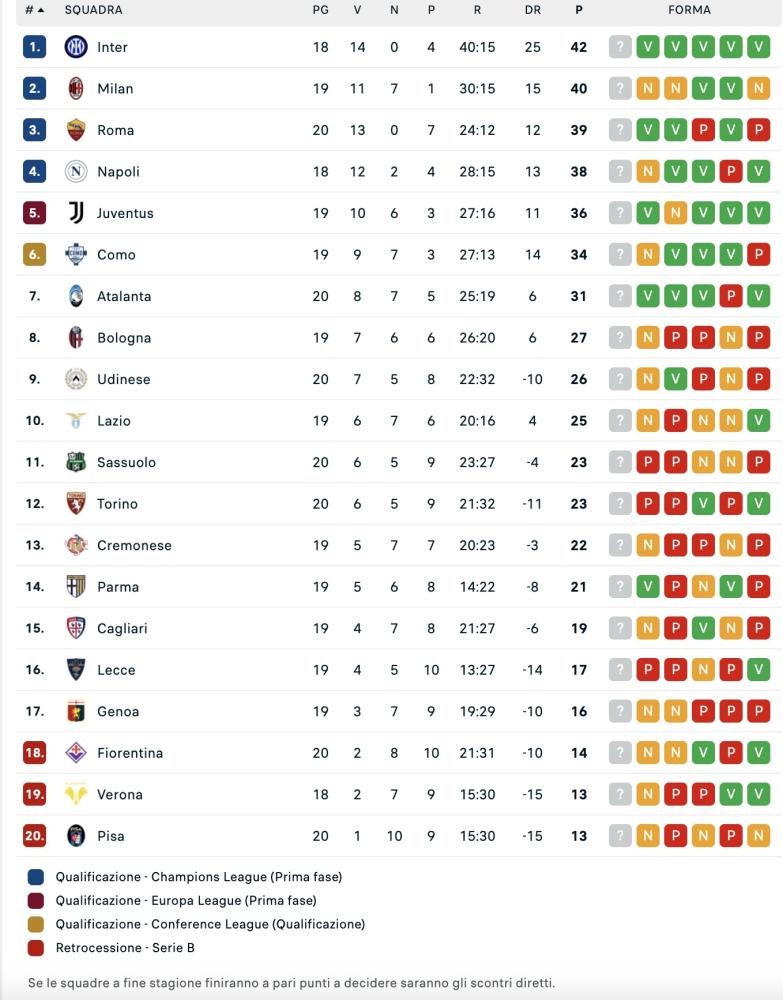 Il Milan riacciuffa la Fiorentina nell'infuocato finale del Franchi, che finisce 1-1 e accorcia provvisoriamente in classifica sulla capolista Inter, ora a +2 ma con una partita in meno rispetto ai rossoneri e quindi potenzialmente a +5. Di seguito la classifica aggiornata di Serie A, che vede i viola terzultimi con 14 lunghezze: