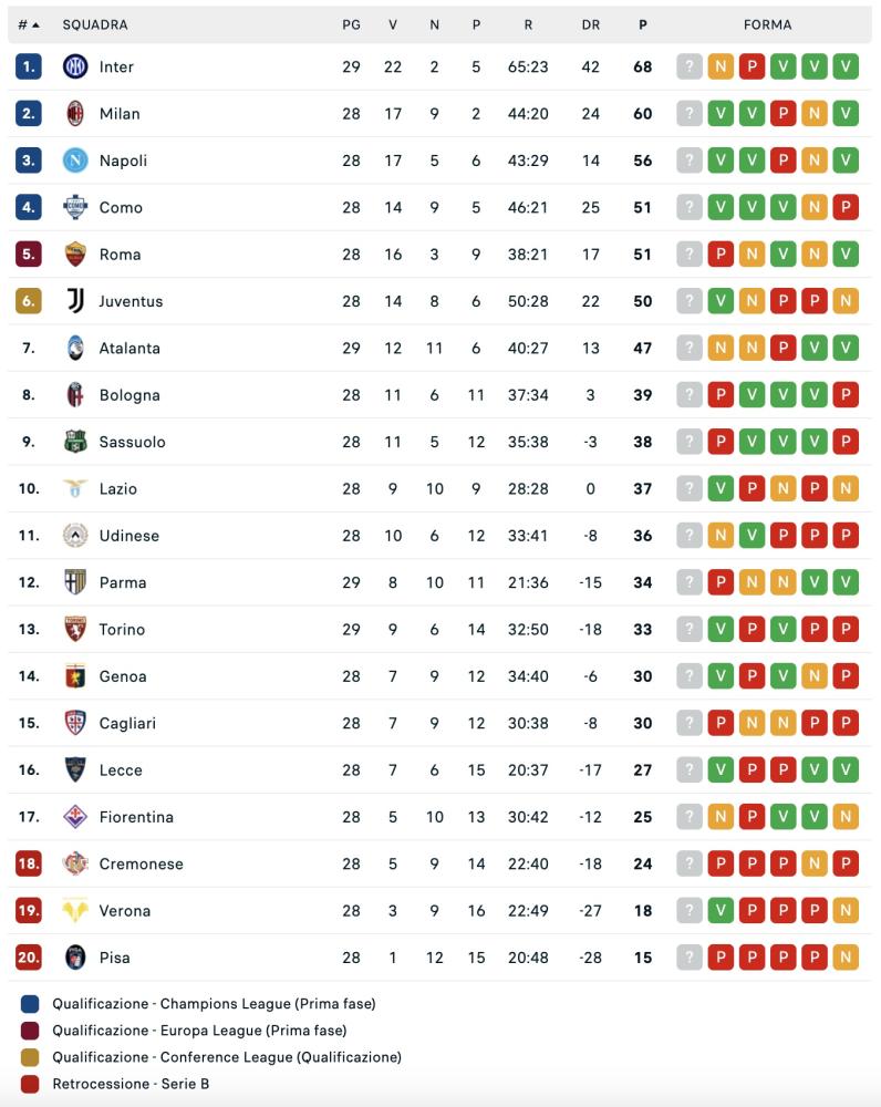 Una frenata pesante in termini di classifica. Se un successo sull'Atalanta avrebbe riportato gli uomini di Chivu a +10 sul Milan, infatti, il momentaneo +8 potrebbe diventare +5 domani sera, con Pulisic e compagni che saranno di scena all'Olimpico contro la Lazio di Sarri. Eventualità che darebbe ancora più spinta al Milan nella volata finale, dopo aver dimezzato lo svantaggio in sole due partite. Chance di accorciare anche per il Napoli, che battendo il Lecce al Maradona si porterebbe a -9 dai nerazzurri. Di seguito la classifica di Serie A aggiornata.