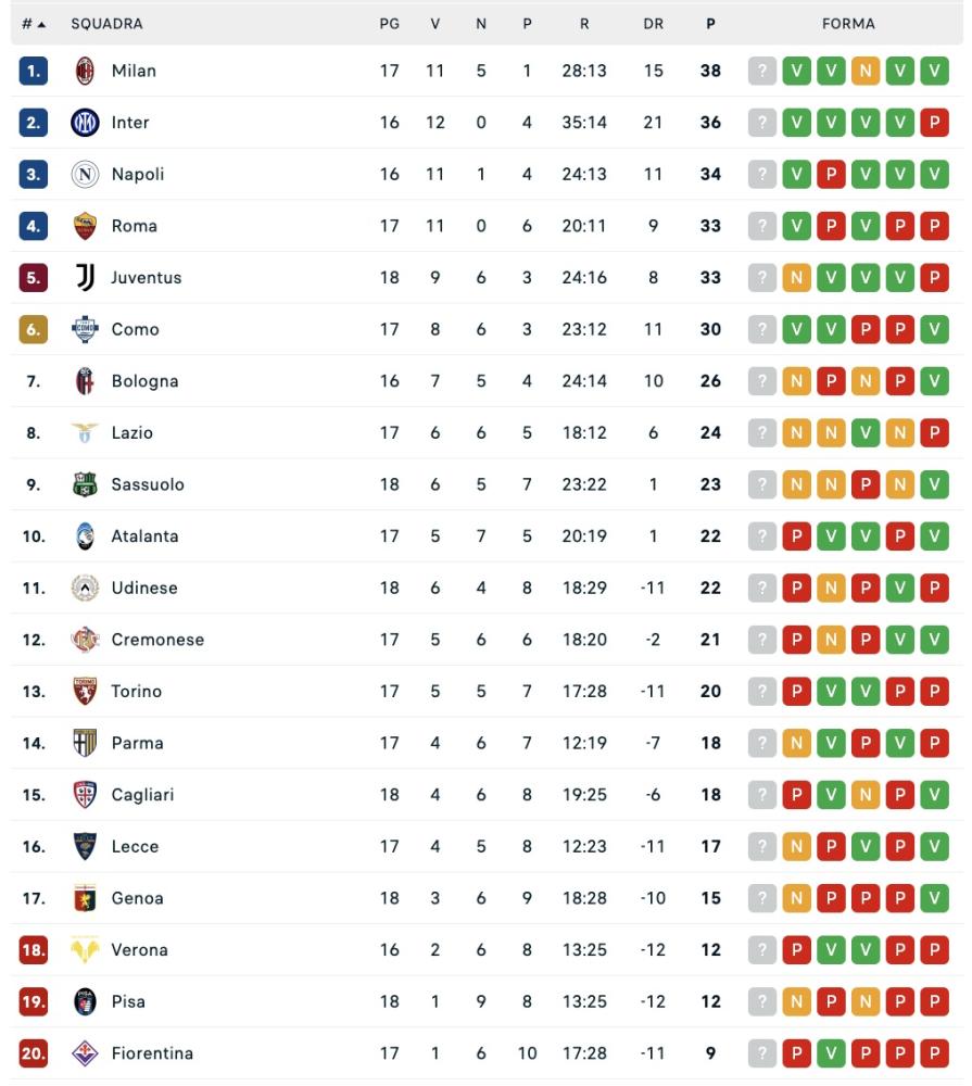 Di seguito la classifica di Serie A aggiornata dopo Juventus-Lecce 1-1: