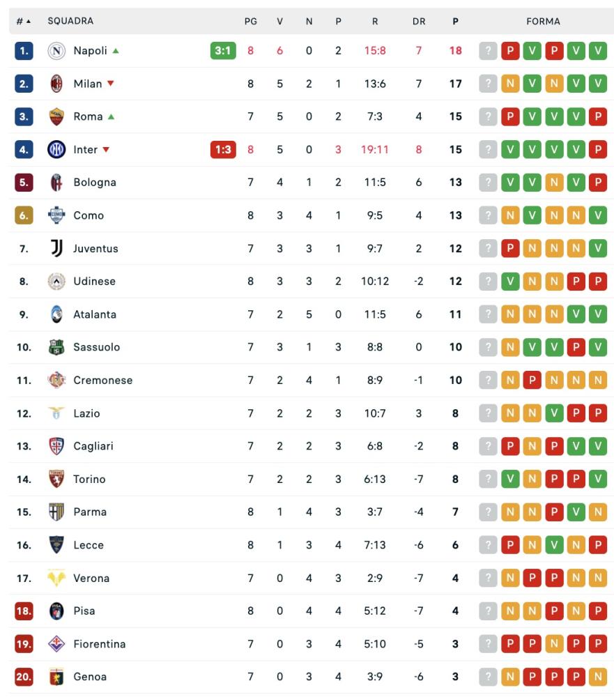Il Napoli reagisce nel migliore dei modi alle due sconfitte con Torino e PSV: i Campioni d'Italia ruggiscono e battono l'Inter per 3-1 allo Stadio Maradona. Così, la squadra di Antonio Conte sale a 18 punti e si riprende la vetta della classifica: i nerazzurri restano ovviamente fermi, a -3, mentre il Milan di Allegri a quota 17 è distante un punto. Domani la Roma giocherà contro il Sassuolo e potrebbe appaiarsi in testa con gli azzurri.